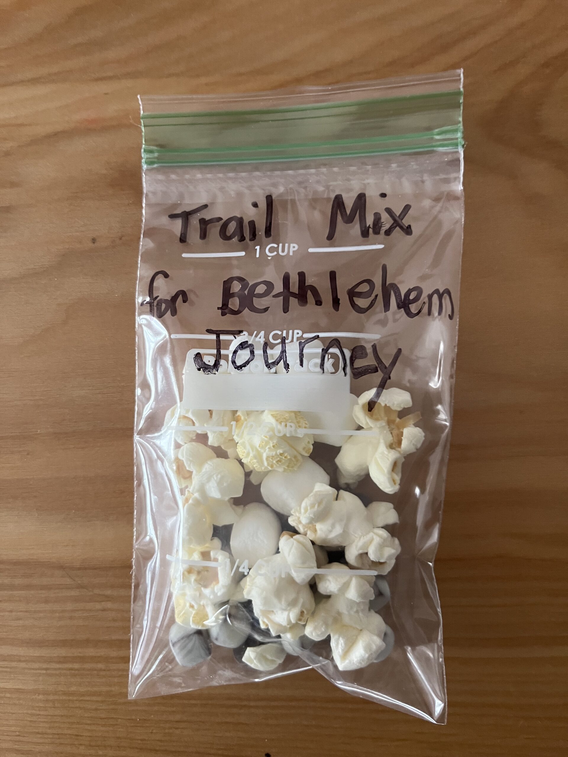 - KITCHEN: each child fills a small baggie with a choice of trail mix ingredients with the help of an adult (tell them it is a take-home snack for the long journey to Bethlehem)