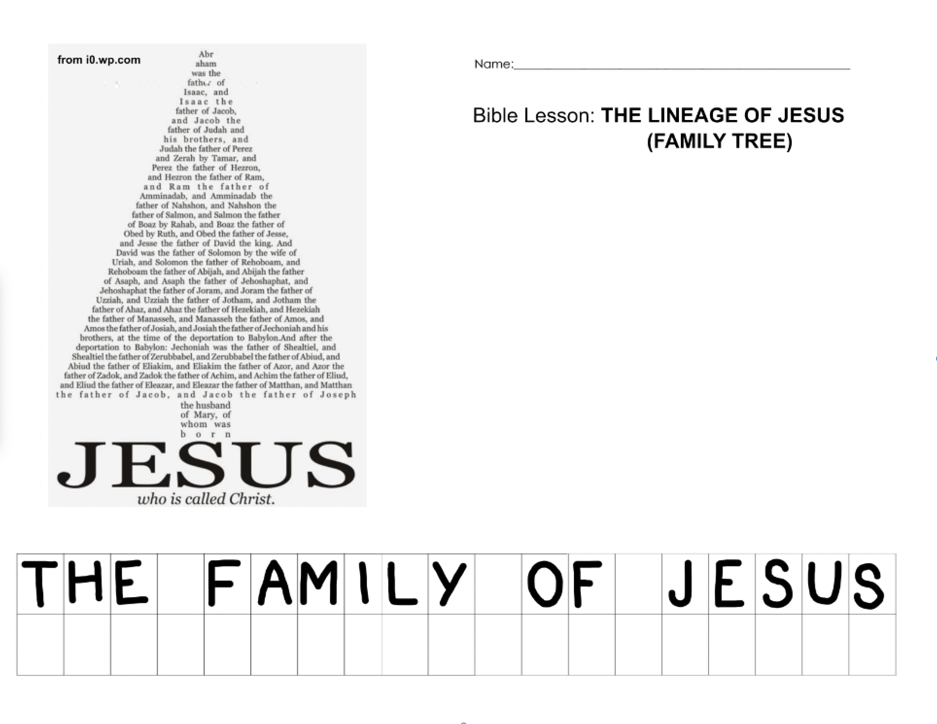 - Use cubes to represent each patriarch in the lineage of Abraham to Jesus. (Matthew 1:1-17) Explain how Jesus had a dad on earth… his name was Joseph. Jesus had a grandfather… his name was Jacob. Jesus had a great-grandfather… his name was Matthew. We can keep going down the line in the family tree until we get to David. Jesus belonged to the family of King David. Keep going… all the way back to Abraham. Do you remember Abraham? God promised to give Abraham a son and when he was 100 years old, his son Isaac was born. Abraham was father to all these generations. The Bible says if we believe in Jesus, we belong to Abraham’s family, too! (Galatians 3:7-9)